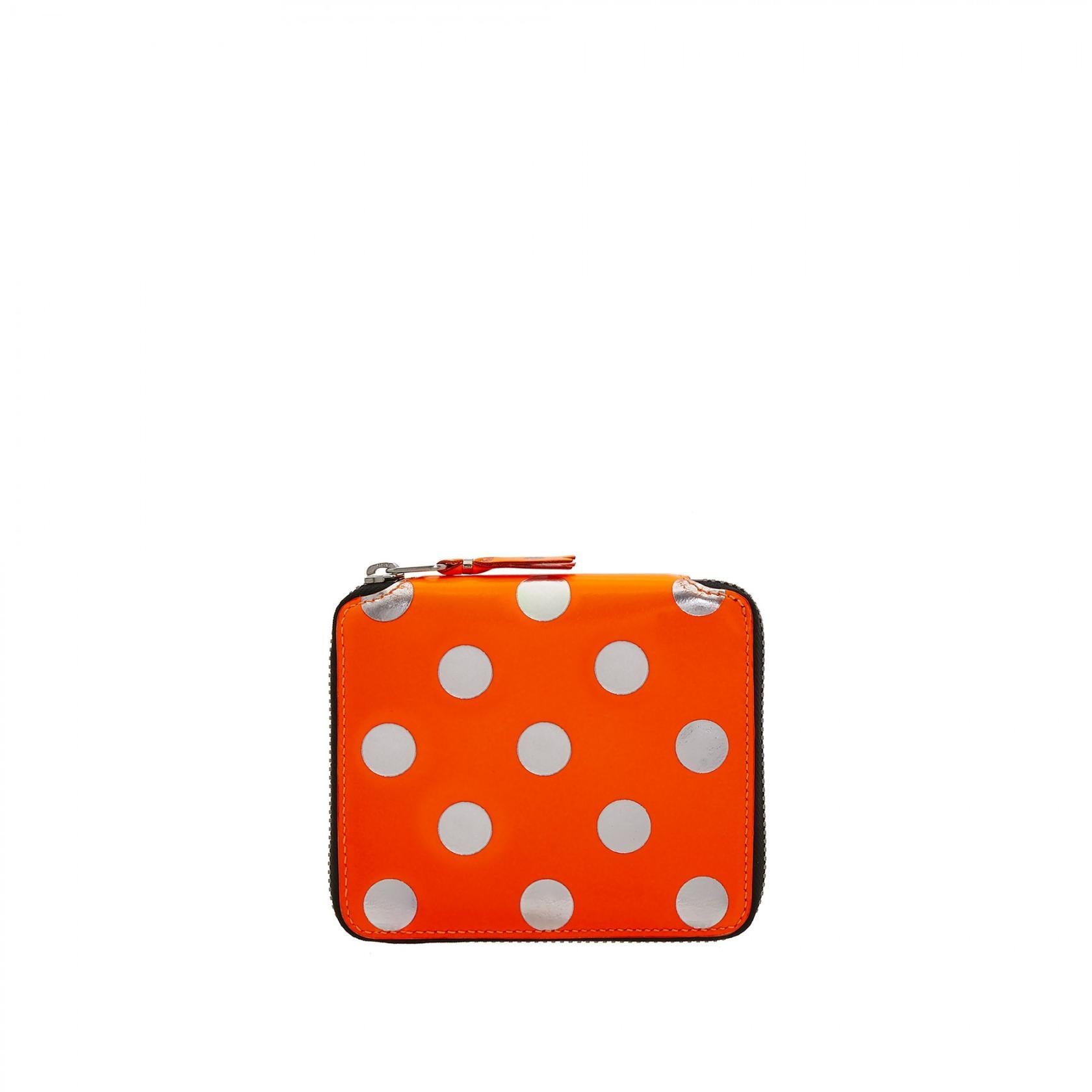 Comme des Garçons fluorescent and laminated leather wallet with polkadots pattern and zip closure. Polkadots leather lining with embossed logo; six credit card slots; one gusseted compartment; two bill compartment; one card compartment and one coin pocket with snap button. Silver-tone metal hardware. Unisex.