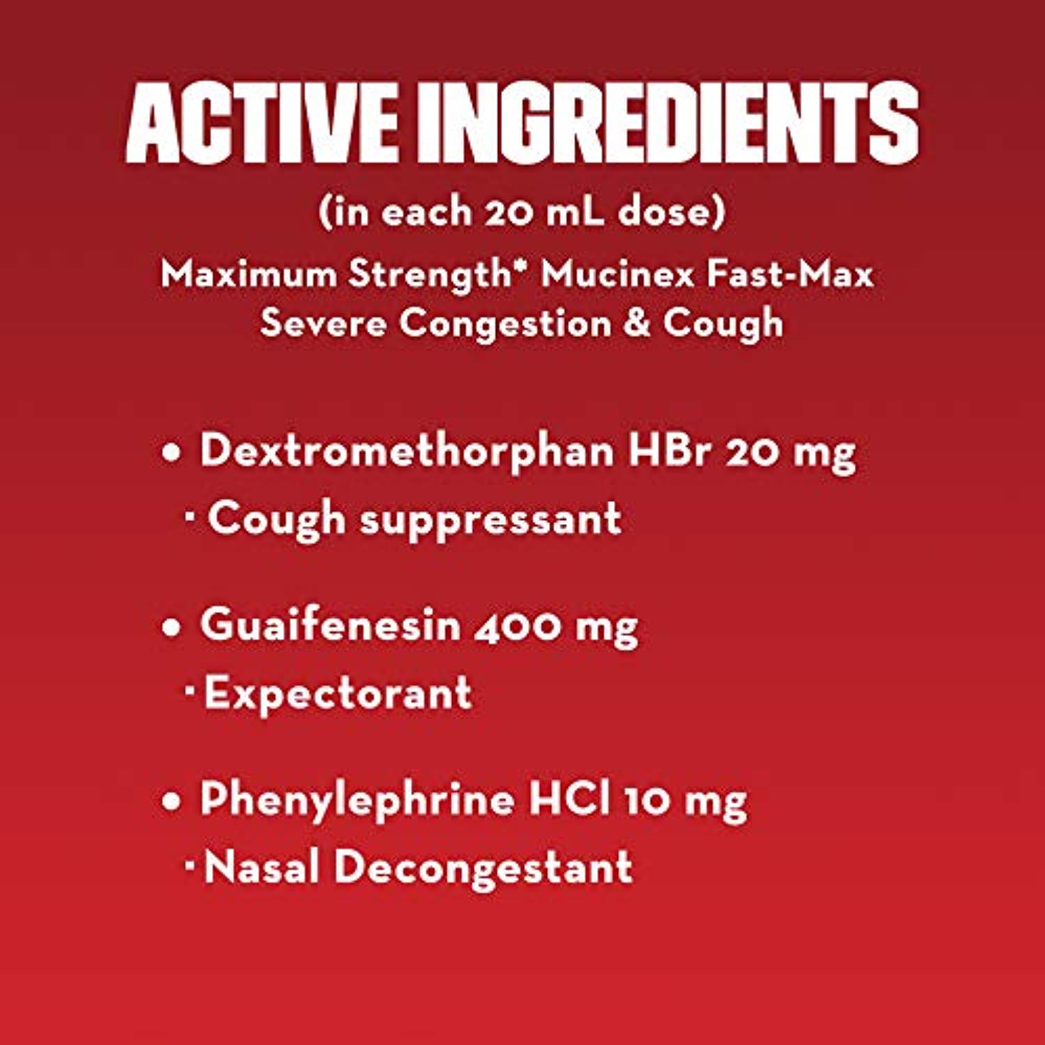 Maximum Strength Mucinex Fast-Max Severe Congestion & Cough is a Multi-Symptom Relief medicine for your Congestion & Cough Symptoms. Maximum Strength Mucinex Fast-Max Severe Congestion & Cough helps relieve cough, thins and loosens mucus and relieves chest and nasal congestion. Mucinex is the #1 most trusted brand among doctors for Cold, Cough and Chest Congestion symptoms for themselves and their families* and #1 Pharmacist Recommended Brand . This product contains 6 Fluid Ounces. Use as directed, for Adults and Children 12 years of age and over. SYMPTOMS RELIEVED: Maximum Strength Mucinex Fast-Max Severe Congestion & Cough helps relieve cough, thins and loosens mucus and relieves chest and nasal congestion ACTIVE INGREDIENTS: Contains Dextromethorphan HBr - cough suppressant; Guaifenesin - expectorant; Phenylephrine HCI - nasal decongestant Take only as Directed *IQVIA using ProVoice Survey, August 2020 U.S. News & World Report/Pharmacy Times 2020-2021