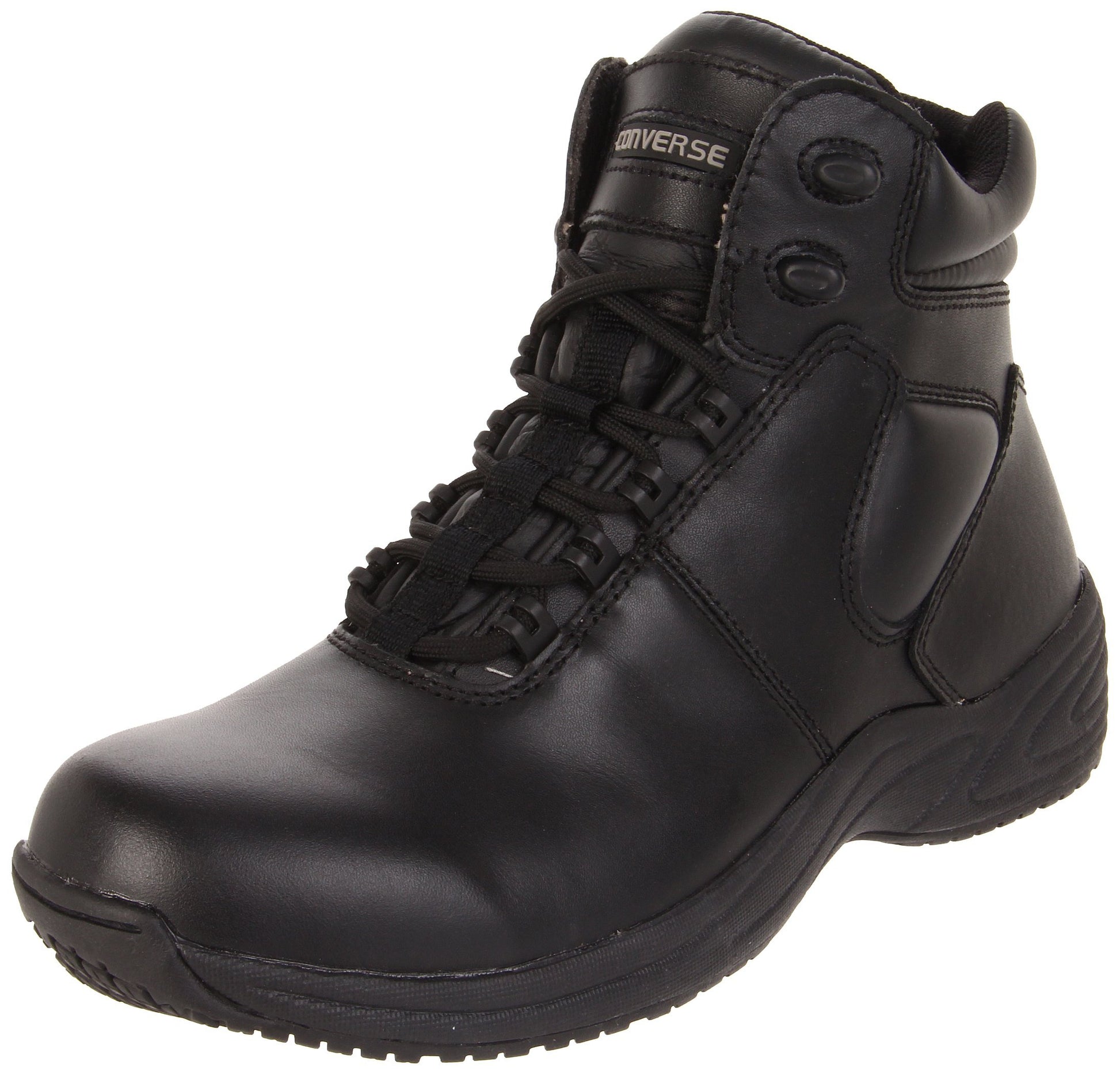 It's March Madness, the NCAA basketball tournament, and it's a fever that strikes us all. In basketball, one name comes up time and time again. Dick Vitale? No! Converse - famous makers of athletic shoes. Want to feel the spirit of March all year round? Converse 1240 Men's 6 Inch Black Leather Slip-Resistant Boots - truly athletic footwear. The shiny black leather is from Converse's Easy Care collection, so you can keep it looking good for much longer. The all-black design is perfect for any occasion (except maybe running at night), with matching black laces and soles. Stitching on the leather adds distinctive detail, for that extra oomph of style.Lightweight, airy Taibrelle lining helps keep feet cool and dry on the inside while you rest on top of EVA foam. The removable cushion inserts and soft midsoles, all made with lightweight EVA, help you have an air-raising athletic experience in your low-cut Converse boots. Removable inserts are great, by the way, for cleaning and odor removal purposes.Sponge rubber heel wedges offer shock-resistance to help with jumping, running, and bouncing back from obstacles. Your weight will rest on top of Converse Sure Grip Plus rubber bottoms, giving you traction and impact-resistance. These non-marking soles are slip-resistant to help you stay on track, and oil-resistant to protect against corrosion when you do. We can't all be basketball players - but we sure can dress like them (at least before they get to the NBA). Put some bounce in your walk with Converse 1240 Men's 6 Inch Black Leather Slip-Resistant Boots.Sizes Manufactured: M: 6-12,13,14 | W: 6-12,13