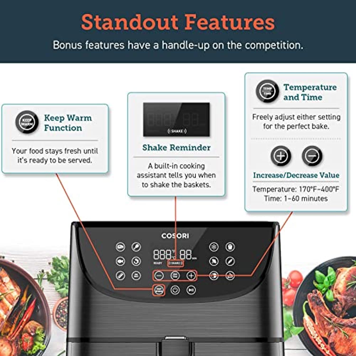- ONE-TOUCH COOKING: Choose from 13 convenient cooking functions with a single touch, each finely tuned by COSORI chefs to product the tastiest results. You can also choose your preferred temperature and time for your personal recipes.