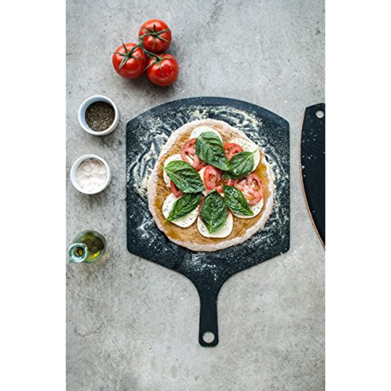 Epicurean dual-sided pizza peel in slate measures 23-Inch by 14-inch. The board features a convenient, easy grip handle. Made in the USA from durable composite material Richlite, our cutting boards are resistant to unwanted flavors, odors, and bacteria. Designed for everyday use, Includes a built-in hole that makes it easy to grab, use and store. Dishwasher safe, temperature resistant to 350 degrees Fahrenheit, and easy on your cutlery.