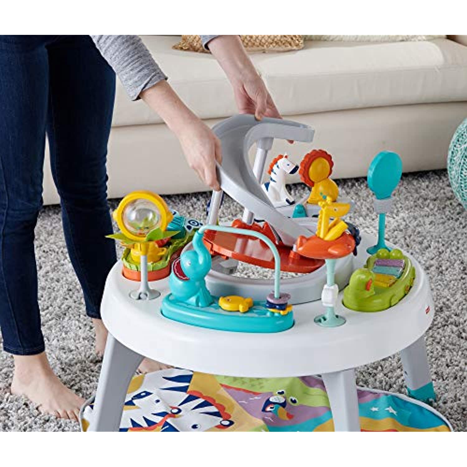 From tummy time, to sitting and spinning, to standing and exploring all around—this 3-in-1, jungle-themed activity center will keep your little monkey busy as can be. The soft play mat and musical alligator are perfect for teeny ones to lay and play, while the fabric seat allows older babies to spin around and discover all 360 degrees of exciting toys and activities. And with an add-on ramp with shape-sorter bugs to send sliding down, toddlers can keep the good times rolling Where development comes into play; Gross Motor: Little muscles get a big workout as they go from sitting and reaching & interacting with the activities to pulling up to a stand and cruising around the table. Sensory: Bright, cheery colors and playful lights and sounds engage your baby's developing senses. Curiosity: As little ones explore the variety of activities, from making music with the alligator to rolling the bugs down the ramp, they're introduced to cause and effect Use only with a child who can hold head up unassisted and who is not able to walk or climb out of product.