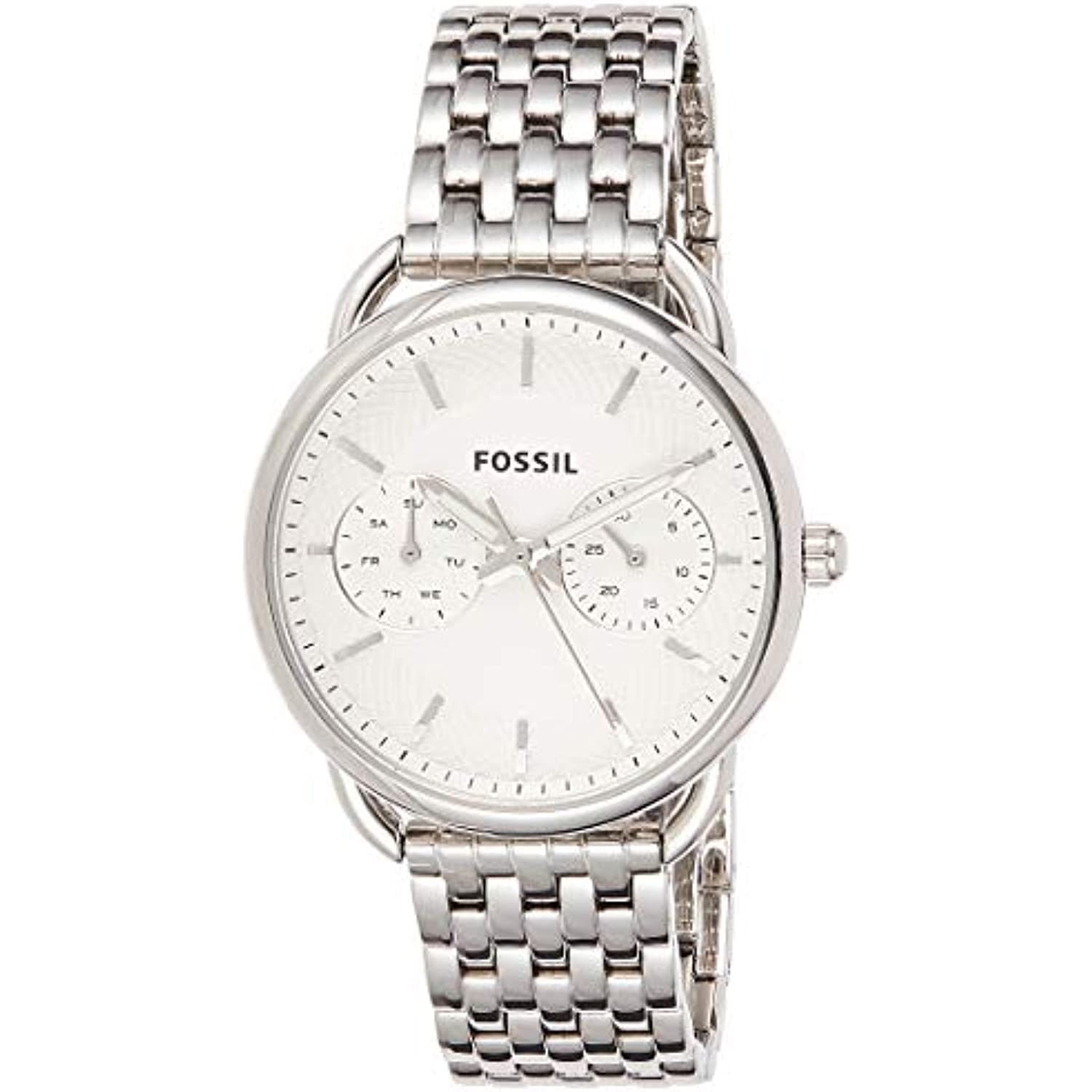 Watch Sizing Guide Add a glimmering lift to your look with the sleek Tailor timepiece from Fossil®! Stainless steel case. Silver-tone bracelet with double press deployment. Three-hand watch with two sub-dials. Silver-tone face with hour markers and two subdials. Water resistant 5 ATM. Imported. Measurements: Case Height: 35 mm Case Width: 35 mm Case Depth: 10 mm Band Width: 16 mm Band Circumference/Length: 9 1⁄4 in Weight: 3 oz