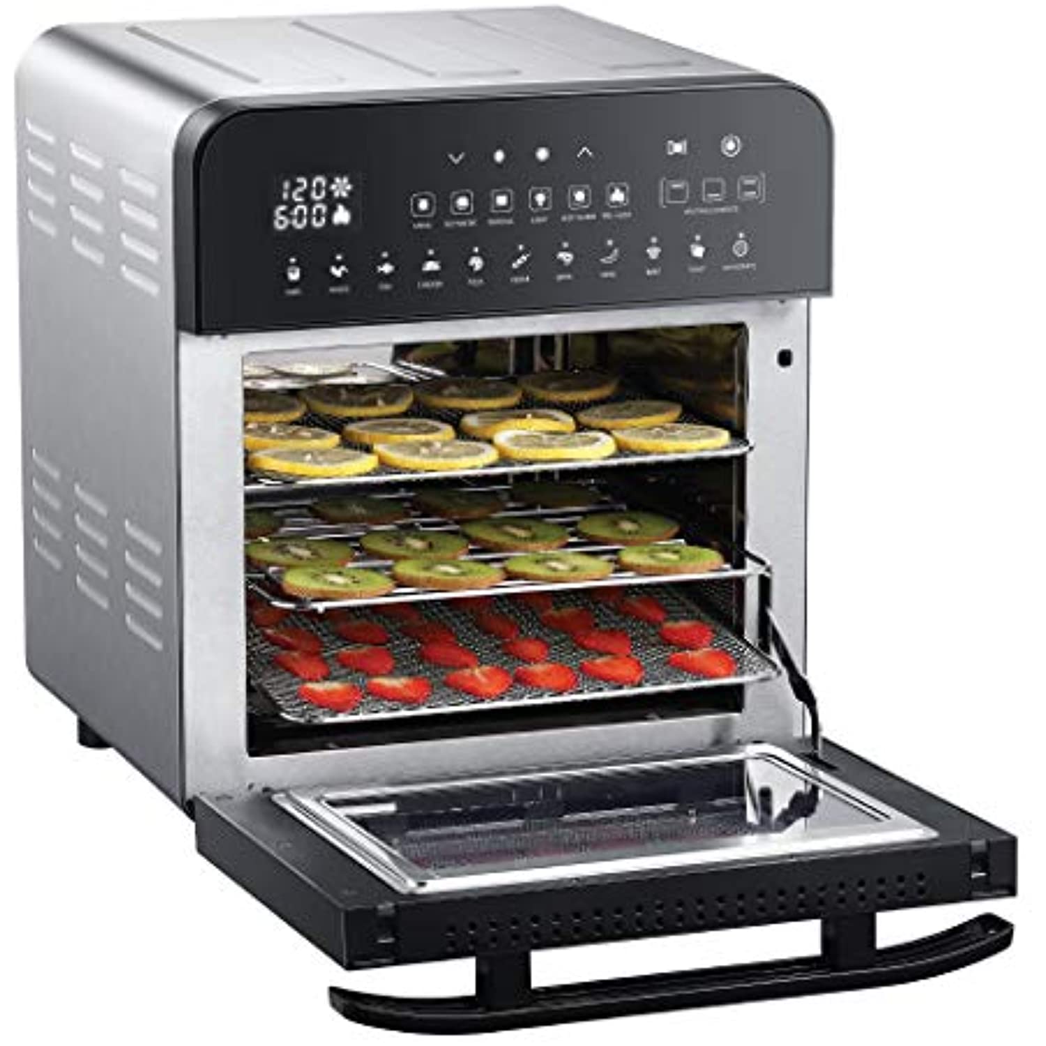 Introducing the 14. 7 Quart Ultimate Air Fryer Oven Grill. It was designed with a high-quality stainless steel interior AND body and comes with 11 accessories to maximize your cooking potential. Air Fry, roast, rotisserie, bake, dehydrate, and even grill! Enjoy new dual heating elements, cutting your cook time heating from all sides. Use the included heavy-duty cast aluminum grill plate to grill meats and veggies to perfection from the comfort of your kitchen.