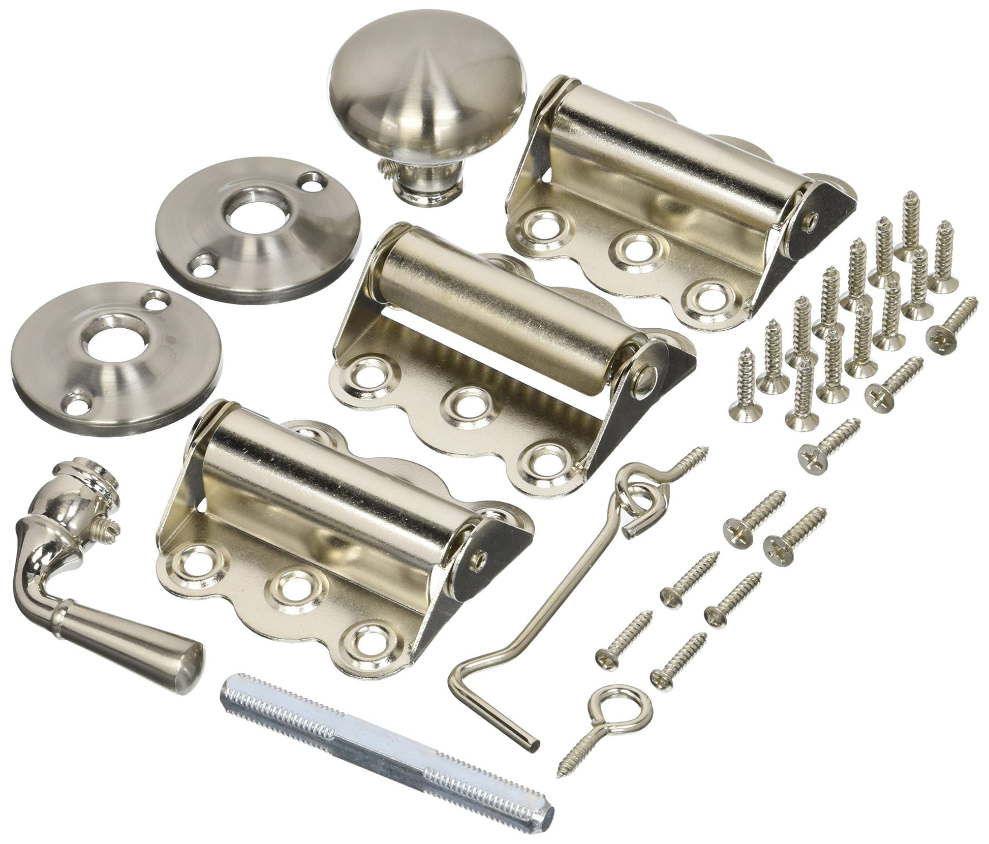 Wright products, satin nickel vinyl or wood screen door hardware set, for screen doors with basic installation hardware, contains three 3 inch spring loaded door hinges for installing your door, 1 knob, 1 lever, rosettes & hook & eye, assures a positive close every time.