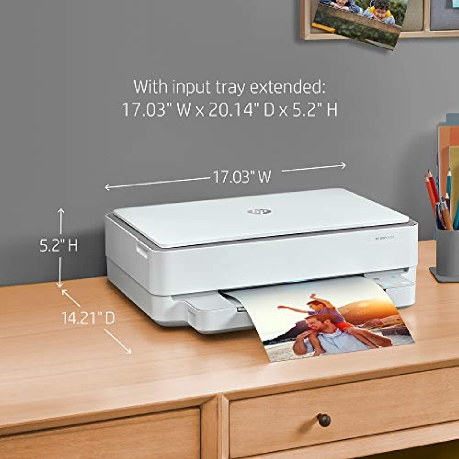 Designed to make printing easier for the whole family, the HP ENVY 6055 all-in-1 Printer lets everyone print, scan, and copy everyday documents, schoolwork, borderless photos, and more. This wireless picture printer can order ink for you and deliver it to your door with up to 50% savings on ink using the HP Instant Ink delivery service, so you can print high-quality documents and photos when you need them (subscription required). Set up and connect the all-in-one printer to your family's mobile devices in a few easy steps for remote scanning and sharing using the HP Smart app. And, keep connected and reduce interruptions with self-healing Wi-Fi.