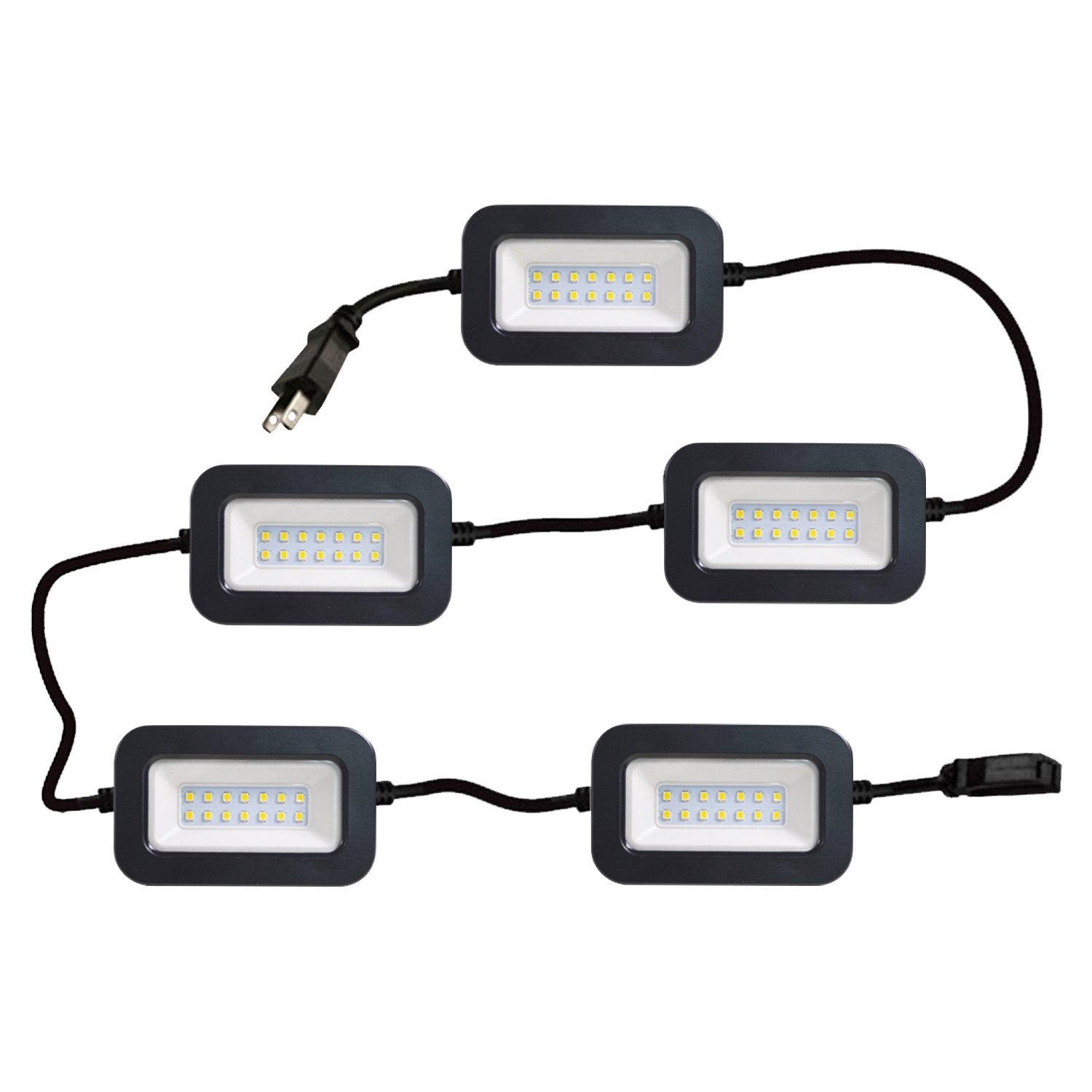 Our super bright, 2500 lumen LED string light is perfect for construction sites, emergency scenes, Christmas tree lots or anywhere a large area needs to be illuminated. The string light's low power consumption makes it perfect to use with a generator. There are 5 high intensity LED light heads (500 lumens each), with a 50' AC power cord. 20 sets of lights can be linked together. Each light head provides 35' of coverage (from 10' height). there is also a carabiner on each light head for easy attachment.