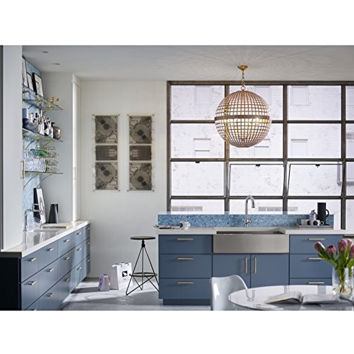 This Strive kitchen sink offers professional style with easy-to-clean curved corners. made of thick, premium quality 16-gauge stainless steel, the apron-front sink has a Self-Trimming design that requires only a simple rough cut, overlapping the cabinet face for beautiful results. The under-mount sink is designed to fit in most standard 36 in. apron-front cabinetry. The single large bowl features a sound-absorption system that significantly reduces disposal and dishwashing noise.
