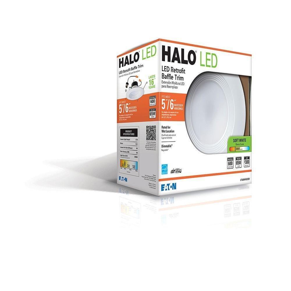 Halo, 5"/6", LED retrofit baffle kit, 600 lumens, 90 CRI, 3000K, 35,000 hours with 70% maintained lumens, dimmable to 10% with LED compatible dimmers, closet & shower rated, wet location listed, air-tite certified, 5 year warranty.
