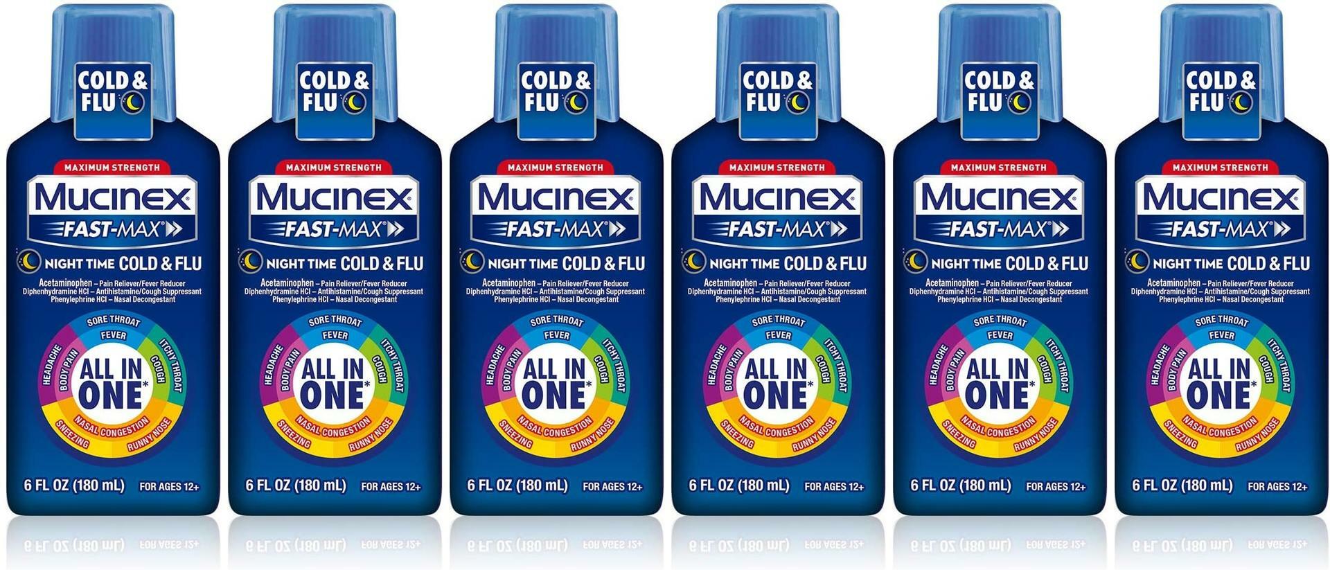Lot of 6 Mucinex Fast-Max Maximum Strength Night Time Cold And Flu Liquid -6oz