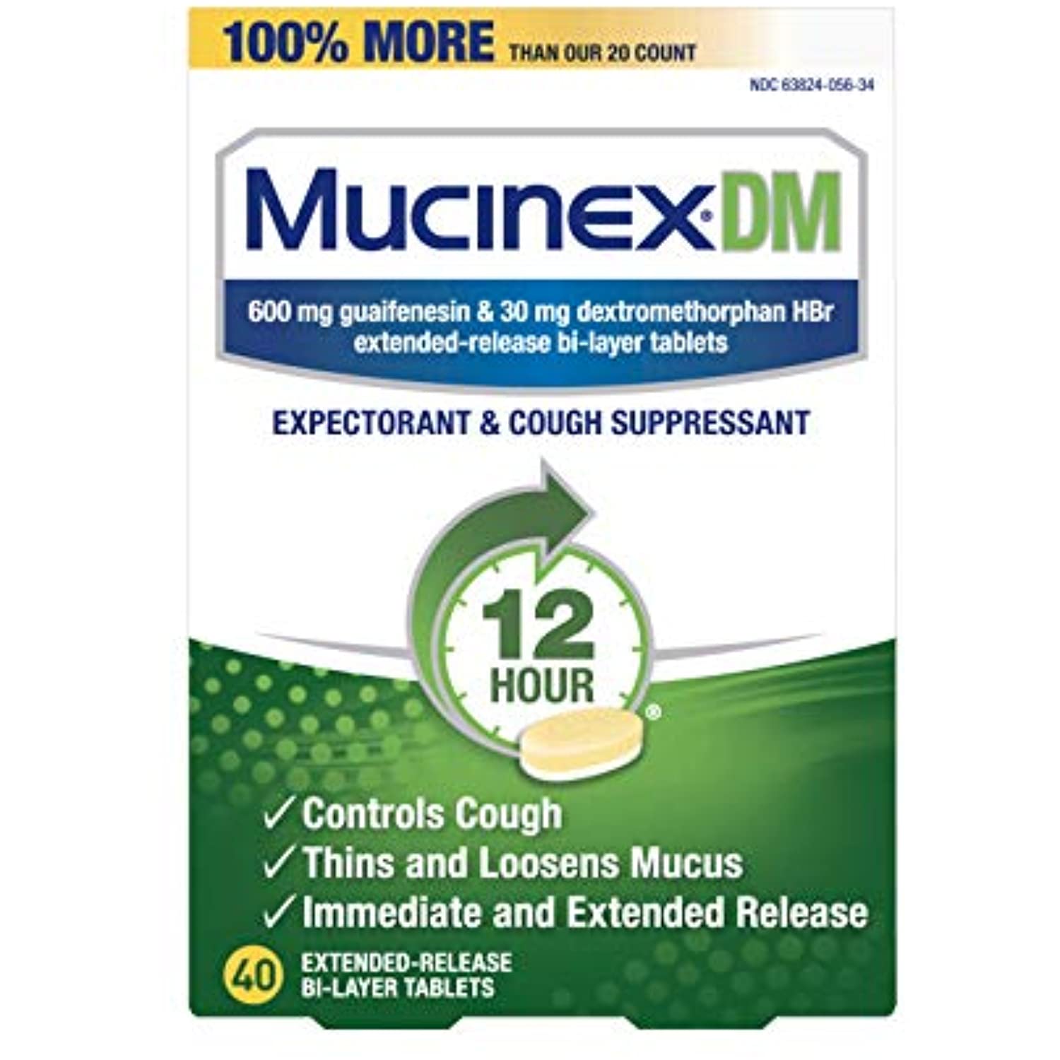 From the Manufacturer Fight both wet and dry coughs for 12 hours with Mucinex DM extended-release bi-layer tablets. Not all coughs are the same. Sometimes you can have a wet cough caused by mucus. Other times, you have an irritating dry cough. Whichever type of cough you have, wet or dry, Mucinex DM will quiet it so you can focus on your life, not your symptoms.Quiets Wet and Dry CoughsMucinex DM extended-release tablets help control both wet and dry coughs for 12 hours. In addition, the extended-release tablets start to work quickly to break up mucus and relieve chest congestion.Works for 12 HoursOnly Mucinex DM has a bi-layer tablet with maximum-strength medicines to fight wet coughs caused by mucus as well as irritating dry coughs. Plus, Mucinex DM works for 12 hours. The extended-release bi-layer tablet is designed with two layers. The first layer is absorbed quickly by your body for fast relief. The other layer dissolves slowly to continue relieving your wet or dry cough for 12 hours.Mucinex: #1 with Doctors, Pharmacists, and ConsumersYou're too busy with family, home, and work to let sickness slow you down. You need a brand you can trust to get the job done. That's why there's Mucinex. Mucinex is the #1 doctor recommended1, #1 pharmacist recommended2 3 and #1 most popular4 OTC expectorant brand. Mucinex products all have the dependable, mucus-busting power to show Mr. Mucus the way out of your system so you can keep up with life.What's in the BoxOne box of Mucinex DM extended-release bi-layer tablets (40 tablets per box).Mucinex DMRelieves these Symptoms:Quiets wet coughs caused by mucusControls irritating dry coughsThins and breaks up mucus to make coughs more productiveUse as directed.Mucinex Has Products for All of Your Worst Symptoms 12 Hour Relief (Tablets)Chest CongestionDry CoughNasal Congestion Maximum Strength Mucinexx Mucinexx Maximum Strength Mucinex DMxx Mucinex DMxx Maximum Strength Mucinex Dxx Mucinex Dxx1 Mucinex is the #1 doctor-recommended OTC expectorant among internists, general practitioners, and family practitioners. IMS Health, NDTI (National Disease Therapeutic Index), MAT 52 Weeks Ending March 2012.2 OTC Expectorants: 2012 Survey of Pharmacist Recommendations: Pharmacy Times, June 2012.3 Among Adult Expectorants and Adult Multisymptom Cold or Flu products. Pharmacy Today Annual Over-the-Counter Survey, February 2012.4 Based on Symphony IRI unit sales data for the 52-week period ending November 25, 2012. Product Description Mucinex DM 12 Hr Expectorant & Cough Suppressant Tablets, 40ct. Brand Story By