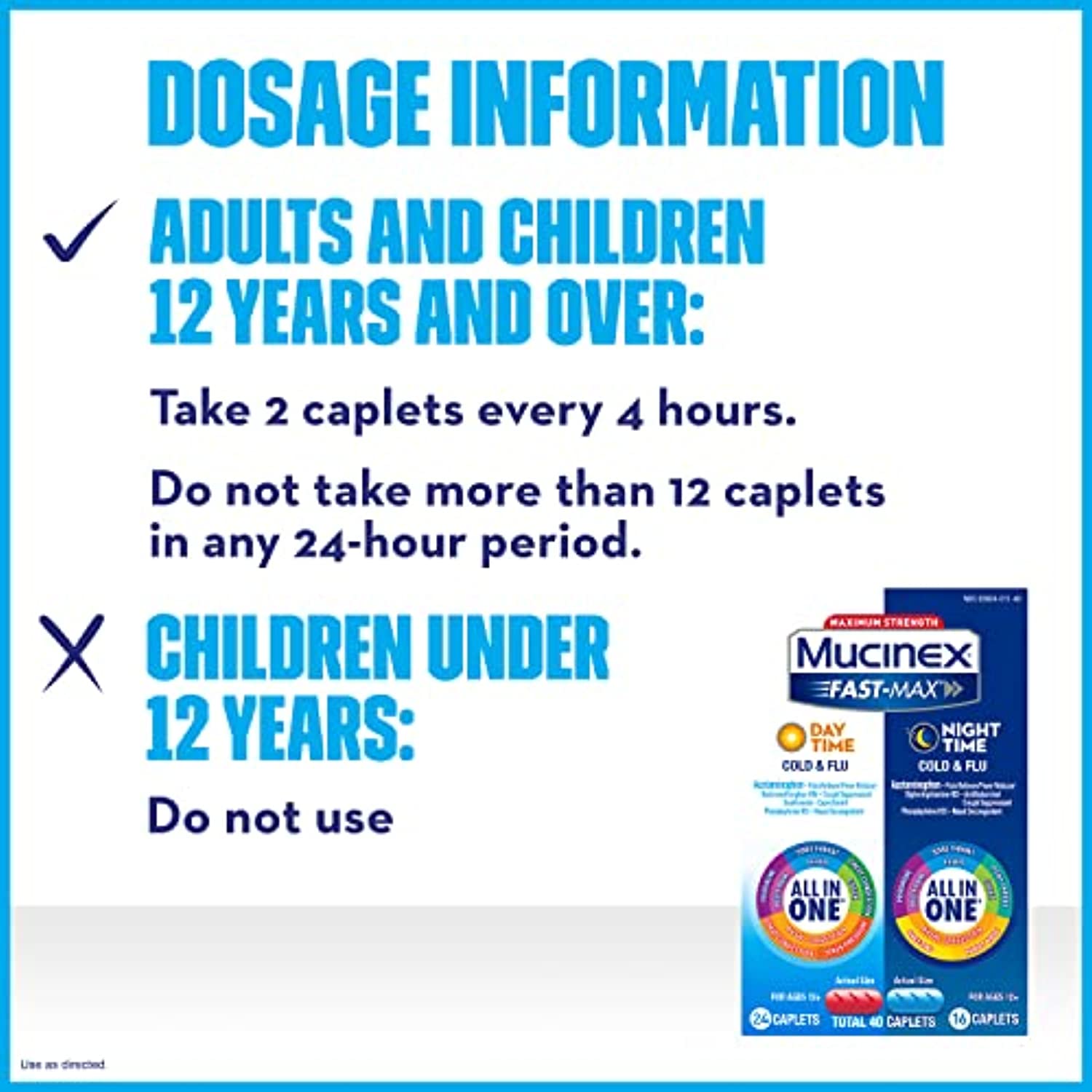 Maximum Strength Mucinex Fast-Max Day time and Night time Cold & Flu Combo pack is a Multi-Symptom Relief medicine and All-in-One solution for Cold & Flu symptoms. Day time caplets help relieve Fever, Cough, Nasal congestion, Body pain, Sore Throat, Chest Congestion, Sinus Pressure & Congestion, Headache. Night time caplets help reduce Fever, relieve Cough, Nasal Congestion, Body pain, Sore Throat, Itchy Throat, Runny Nose, Sneezing and Headache Mucinex is the #1 Cold and Cough brand doctors trust for themselves and their families and #1 Pharmacist Recommended Brand as well.