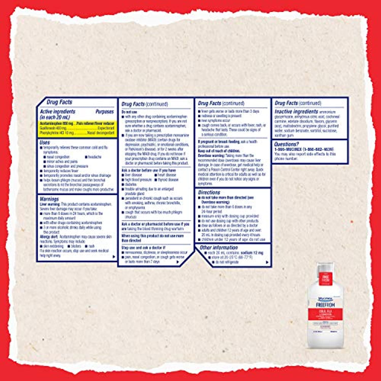 - MULTI-SYMPTOM COLD, FLU & CONGESTION RELIEF: Mucinex FreeFrom Cold, Flu & Congestion helps these common cold and flu symptoms: relieves nasal & chest congestion, sore throat, headache, minor aches and pains, and reduces fever.