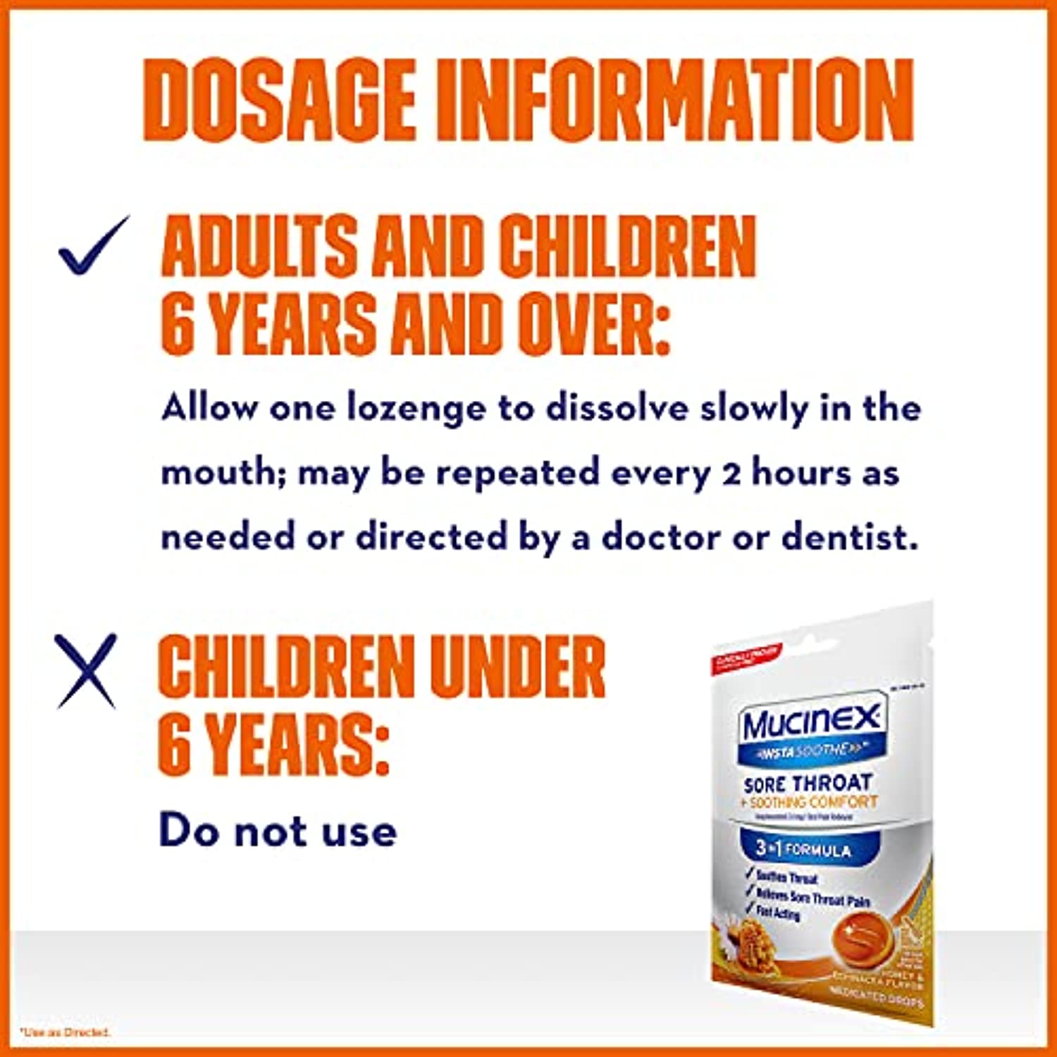 - CLINICALLY PROVEN TO NUMB PAIN FAST: Take the sting out of your sore throat with fast acting, Mucinex InstaSoothe Sore Throat + Soothing Comfort Honey & Echinacea Flavor 3-in-1 medicated drops. Made with Real Honey!