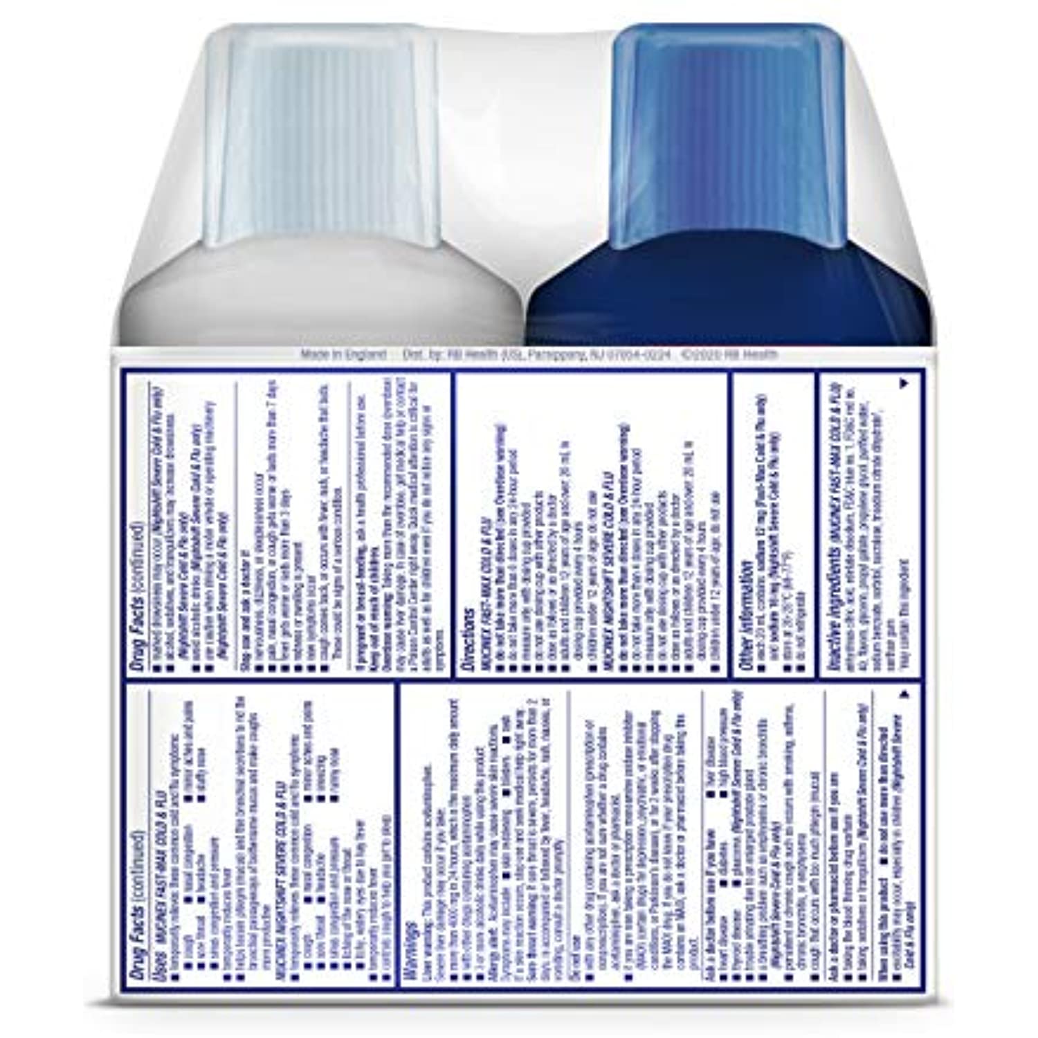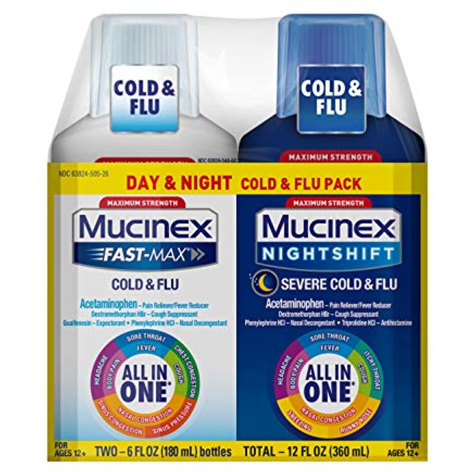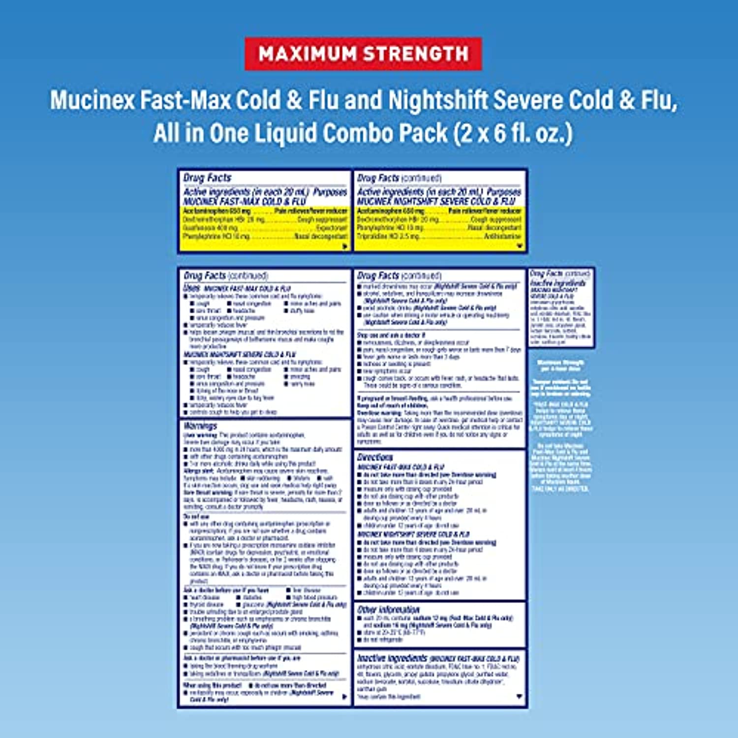 Maximum Strength Mucinex Fast-Max Cold & Flu and Mucinex NightShift Maximum Strength Severe Cold & Flu Day Night Combo pack is a Multi-Symptom Relief medicine and All-in-One solution for Cold & Flu symptoms. Fast-Max Cold & Flu liquid help reduce Fever, relieves Cough, Nasal congestion, Body pain, Sore Throat, Chest Congestion, Sinus Pressure & Congestion, Headache. NightShift liquid reduce Fever, relieves Cough, Nasal Congestion, Body pain, Sore Throat, Itchy Throat, Runny Nose, Sneezing and Headache. Mucinex is the #1 Cold and Cough brand doctors trust for themselves and their families and #1 Pharmacist Recommended Brand as well.