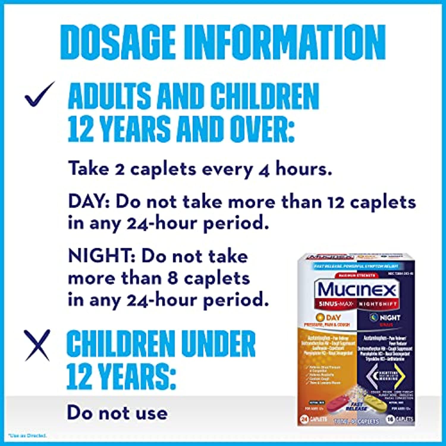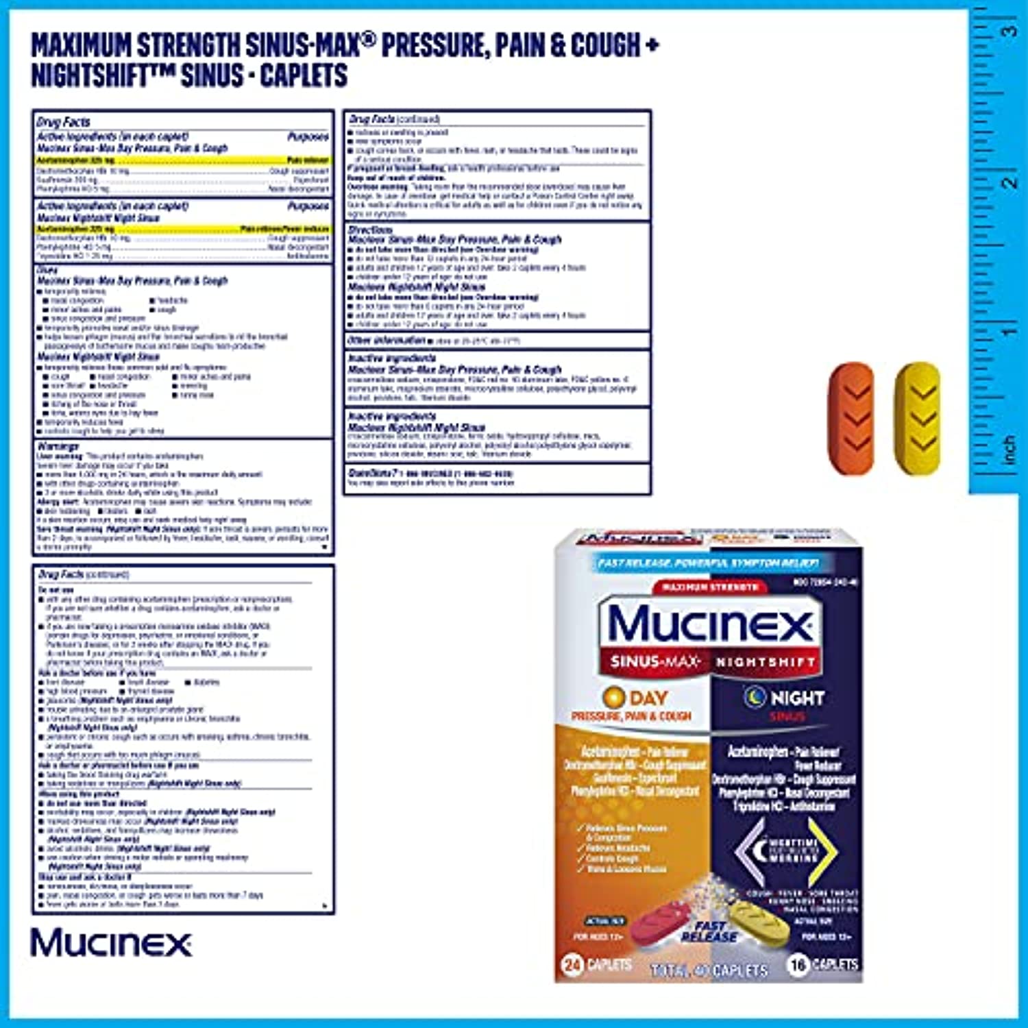 Maximum Strength Mucinex Sinus-Max Pressure, Pain & Cough & Nightshift Sinus Caplets is an OTC medicine for relief of your Multi-symptom Sinus Relief. Maximum Strength Mucinex Sinus-Max Day Pressure, Pain & Cough Caplets help to relieve pain, sinus pressure & congestion, headaches, controls cough and thins & loosens mucus. Maximum Strength Mucinex Nightshift Sinus Caplets help to relieve pain, cough, fever, sore throat, runny nose, sneezing & nasal congestion. Nighttime relief for a better morning!. Mucinex is the #1 Cold and Cough brand doctors trust for themselves and their families*. This product contains 40 Caplets (24 Day + 16 Night). It can be used by Adults and Children 12 years of age and over. Mucinex Sinus-Max Day Pressure, Pain & Cough contains Acetaminophen - Pain reliever and Fever reducer; Dextromethorphan HBr - Cough Suppressant; Guaifenesin - Expectorant; Phenylephrine HCI - Nasal Decongestant. Mucinex Nightshift Sinus contains Acetaminophen - Pain reliever and Fever reducer; Dextromethorphan HBr - Cough Suppressant; Phenylephrine HCI - Nasal Decongestant; Triprolidine HCI - Antihistamine. Do not take the Mucinex Sinus-Max Pressure, Pain & Cough & Nightshift Sinus Caplets at the same time. Always wait at least 4 hours before taking another dose of Mucinex caplets. Take only as Directed *IQVIA using ProVoice Survey, August 2020