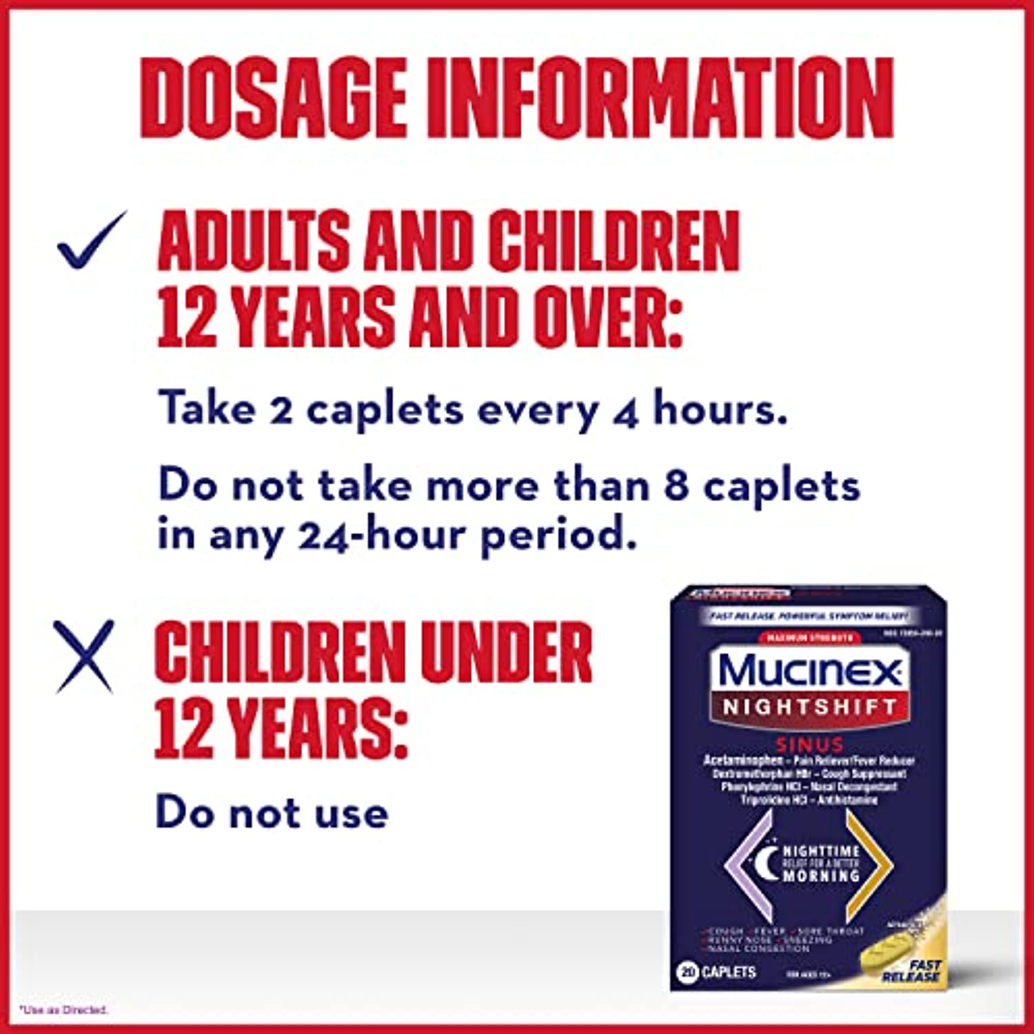 Mucinex Nightshift Sinus is a Multi-Symptom Relief medicine for Sinus & Cold & Flu symptoms. Fast release nighttime caplets reduce fever, relieve cough, relieve sore throat, runny nose and nasal congestion to help you get to sleep. Nighttime relief for a better morning! Mucinex is the #1 Cold and Cough brand doctors trust for themselves and their families*. This product contains 20 caplets. It can be used by Adults and Children 12 years of age and over. NIGHTTIME ACTIVE INGREDIENTS PER CAPLET: Contains Acetaminophen - Pain reliever and Fever reducer; Dextromethorphan HBr - Cough Suppressant; Phenylephrine - Nasal Decongestant and Triprolidine HCI - Antihistamine. Always wait at least 4 hours before taking another dose of Mucinex caplets. Do not take more than a total of 8 caplets in any 24-hour period. Take only as directed. *IQVIA using ProVoice Survey, August 2020