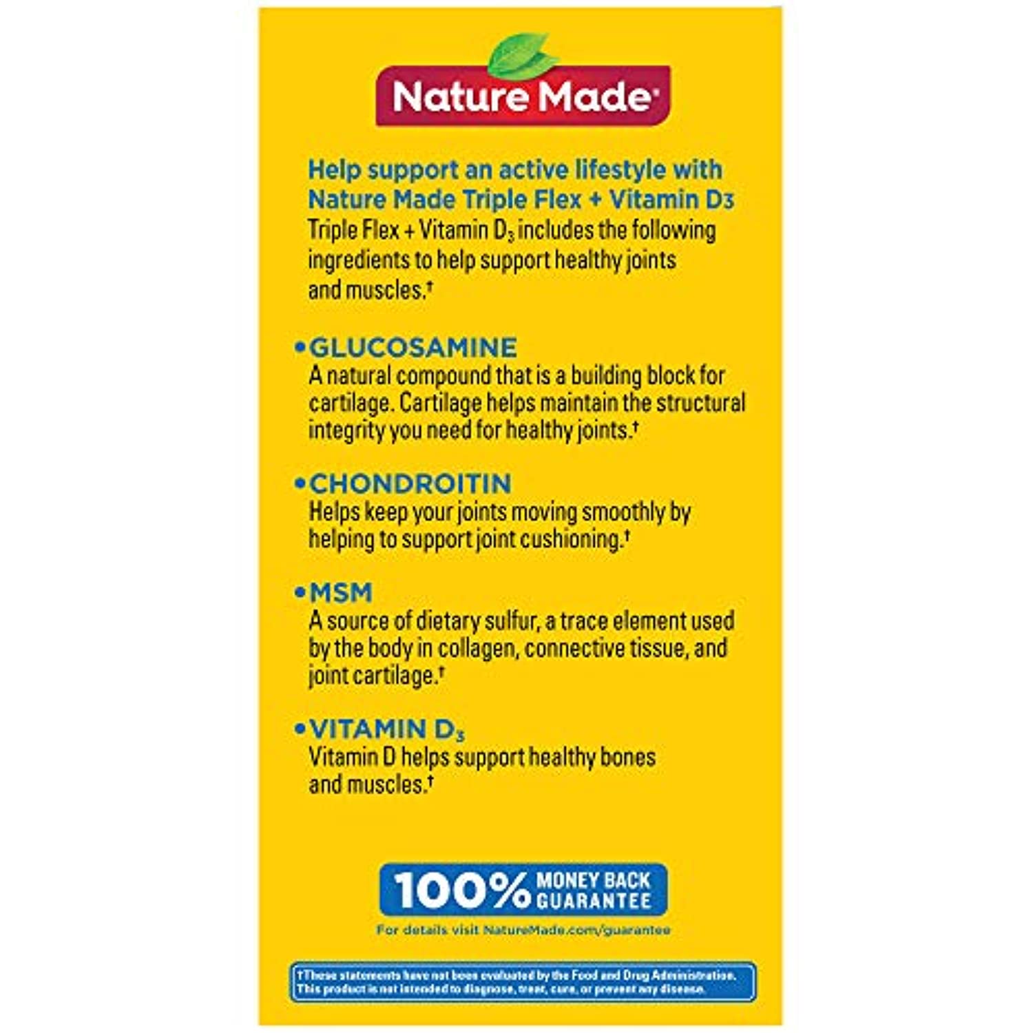 Help support an active lifestyle with Nature Made TripleFlex Triple Strength(1) with Vitamin D. Nature Made TripleFlex Triple Strength with Vitamin D 50 mcg (2000 IU) is formulated with key nutrients plus Vitamin D3 to help support joint health, muscle health and healthy bones. Nature Made TripleFlex Triple Strength is a combination of three ingredients to help support joint health with two caplets daily. Glucosamine is a natural compound that is a building block for cartilage. Cartilage helps maintain the structural integrity you need for healthy joints. Chondroitin helps keep your joints moving smoothly by helping support joint cushioning. MSM is a source of dietary sulfur, a trace element used by the body in collagen, connective tissue and joint cartilage. Vitamin D helps support healthy bones and muscles. (1)Contains glucosamine hydrochloride (1500 mg), chondroitin sulfate (800 mg), MSM (750 mg), and Vitamin D3 2000IU (50 mcg) per two caplets.
