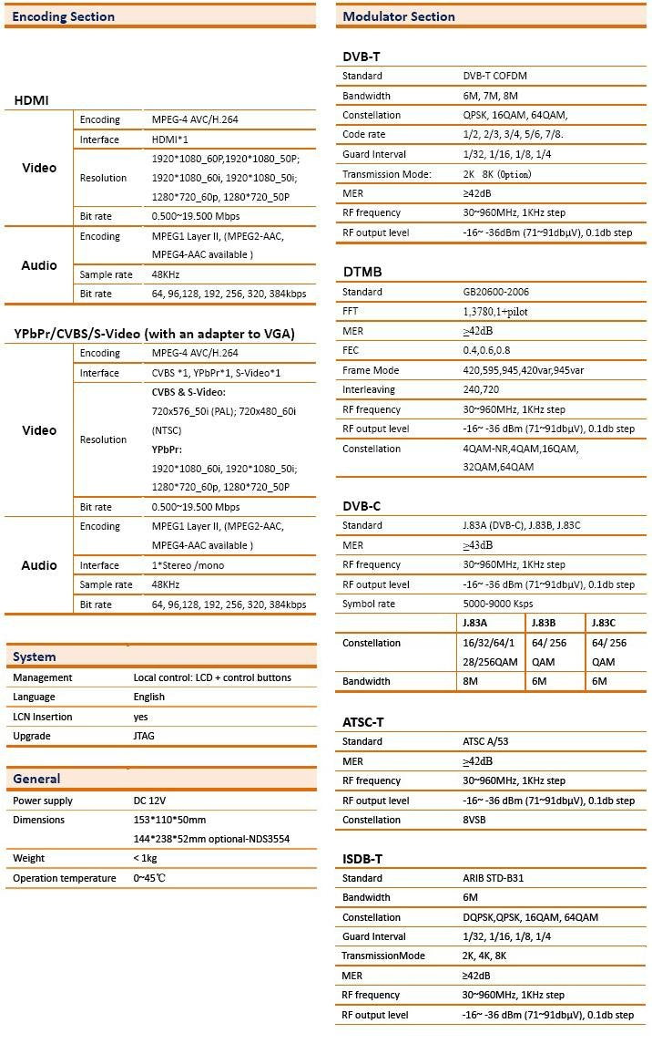 It is an all-in-one device integrating MPEG-4 AVC/H.264 encoding and modulating to convert audio/video signals into DVB-C RF out.