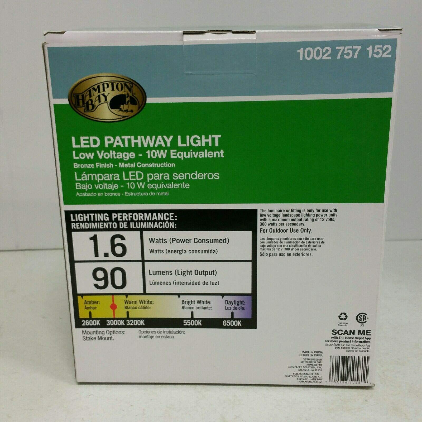 This Hampton Bay Low Voltage Bronze Outdoor LED Path Light provides the same bright light as a typical halogen landscape path light, but uses over 80% less energy and boasts a rated life of 50,000 hours. The integrated LED light source means maintenance-free operation and no bulbs to change for the entire life of the fixture. Top-quality features include all-metal construction, a long-life powder-coat finish, weatherproof electronics and a quick-install wire connector. Do-it-yourself installation is fast, easy and safe. In this fixture, the light is directed toward the ground, creating a beautiful pattern of soft light ideal for illuminating steps, pathways and smaller plants, as well as enhancing security. All-weather aluminum constructed housing ensures lasting outdoor use Powder-coated bronze finish brings a durable classic touch to your landscape 3000K delivers bright white light for clear illumination Cleated, heavy-duty stake for quick and easy installation Quick-install wire connector LED life of 50,000 hours