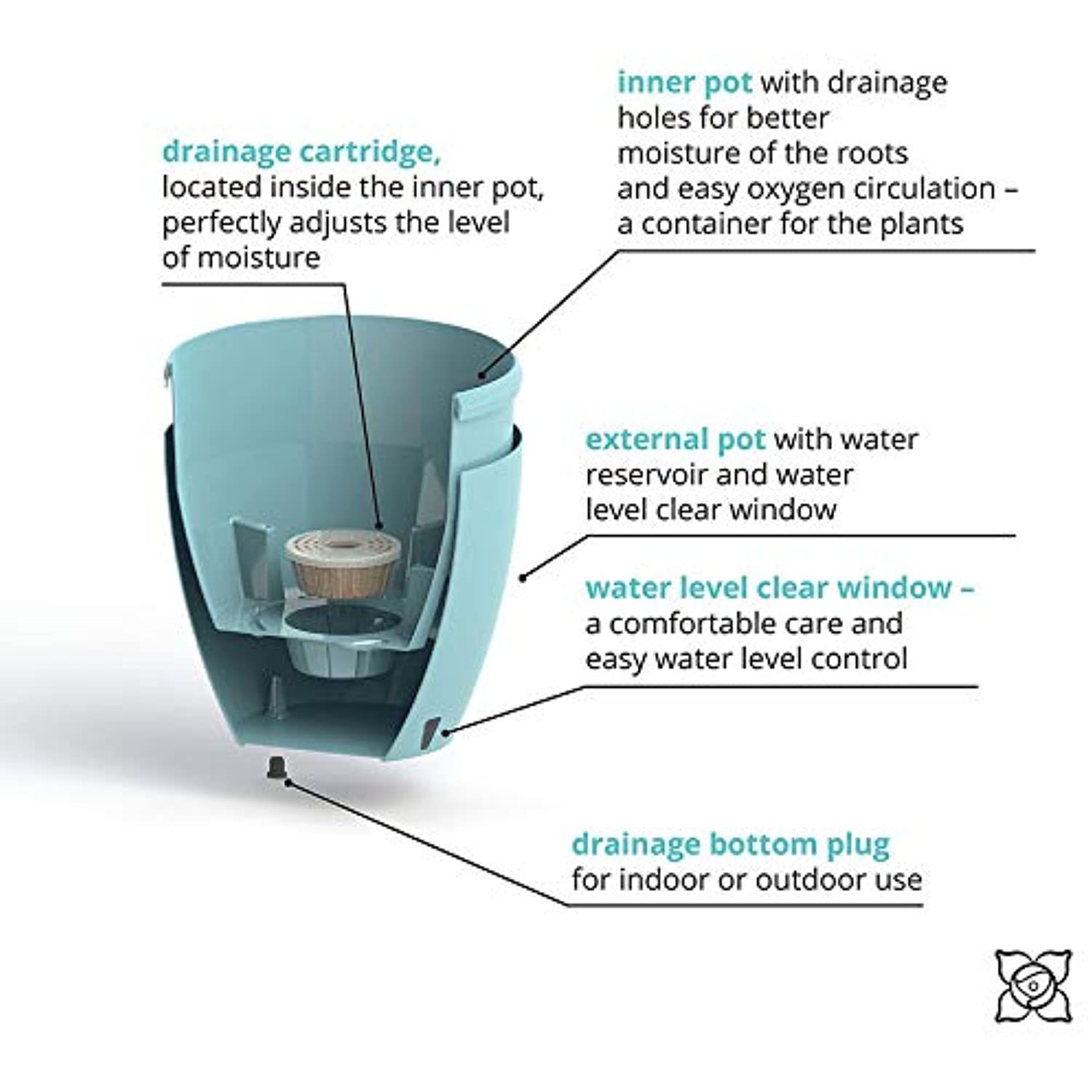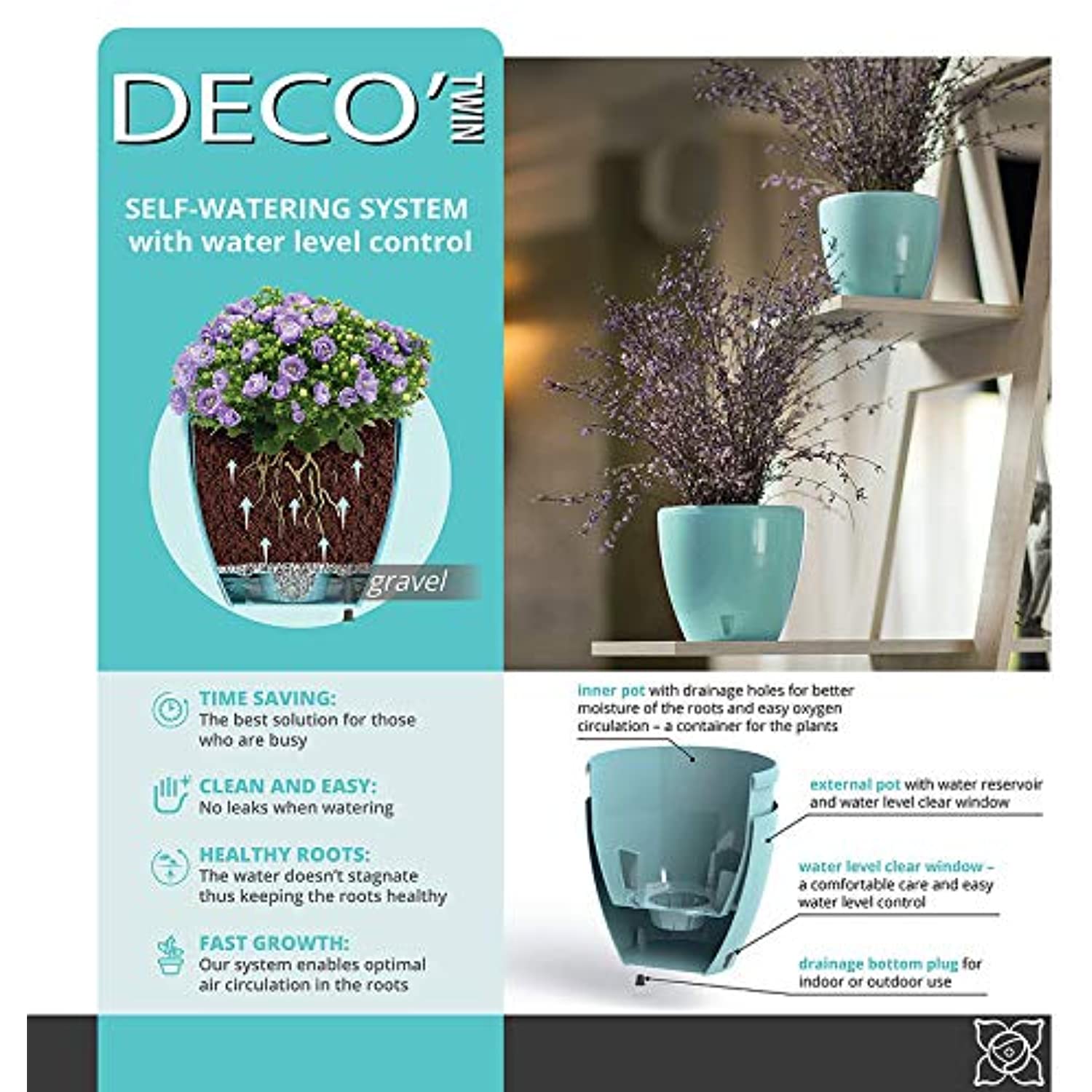 With the Santino Deco 8.8 in. Self-Watering Planter, you can fill the self-watering reservoir and take a vacation from gardening for up to four weeks. Perfect for busy people, this planter maintains root health by allowing proper drainage to occur within the leak-free pot. UV-stabilized, durable plastic is offered in several color options. Great for indoor or outdoor use. Dimensions: 8.8 diam. x 7.5H in.. Constructed from plastic. Select from available color options. Built-in reservoir self-waters plants. Use indoors and outdoors. 1.4 gallon capacity with 18 oz. reservoir. UV stabilized, durable, and reusable. Draws water up to 4 weeks and circulates oxygen.